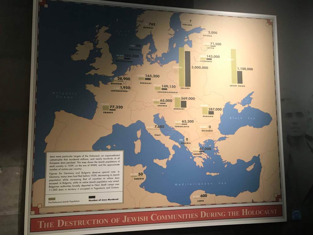 In addition to an authentic German train car, like the ones used to deport Jews to concentration camps, and Nazi hunter Simon Wiesenthal’s desk (read his book about forgiveness called The Sunflower), the Museum contains many other interesting objects as well.  The silver Judaica objects near the exit to the Museum were confiscated from Jewish homes by the Nazis, and eventually found by U.S. troops in German warehouses after the War (vividly depicted in the 2014 film The Monuments Men).  An organization called the Jewish Cultural Reconstruction, Inc. (JCR for short) formed soon after the War with the mission of finding the original owners of these objects.  Since most of the owners had perished, these items were ultimately donated to different Jewish organizations throughout the world.  The silver objects at the ILHMEC are on long-term loan from the Hebrew Theological College in Skokie, which received these objects from the JCR back in the 1950s.  Because they were kept in storage for so long, they arrived at the Museum tarnished and dark in 2013.  As an intern at the Museum, I had the privilege of polishing these special items.