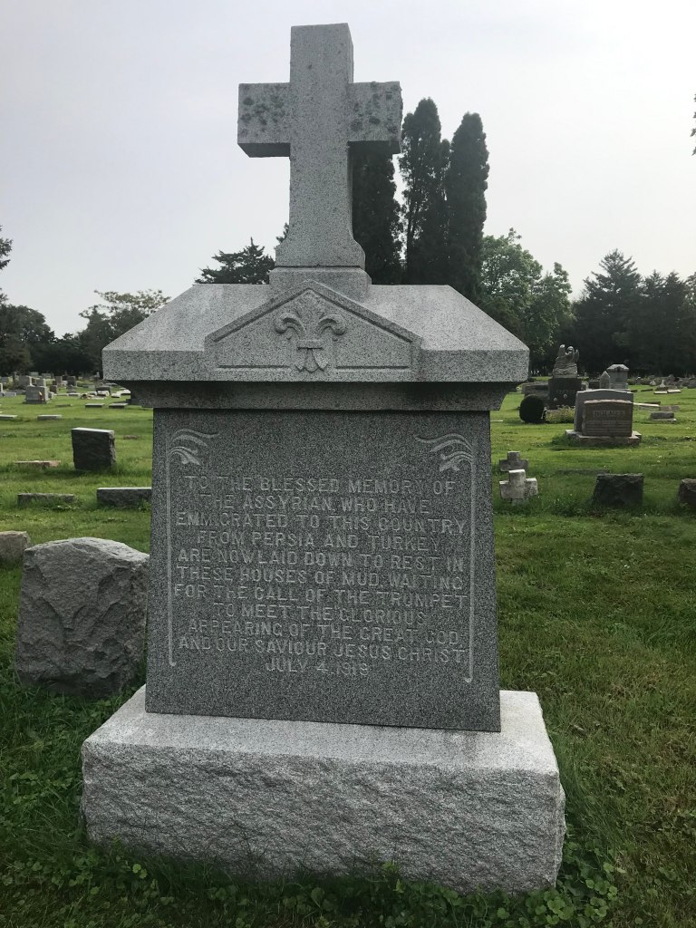 My research eventually led me to visit the Elmwood Cemetery in River Grove, Illinois. This cemetery used to be an American Civil War post before it became a graveyard, so it now has some Civil War memorials. An Assyrian Church eventually purchased plots in this cemetery. Section 45 not only has the Assyrian War Memorial, but also contains numerous Assyrian graves, many of which have tombstones written in the Aramaic script, Syriac. The majority of these graves date to the first half of the twentieth century. (Most of the more recent Assyrian graves can be found at the Montrose Cemetery in Chicago, including the grave of the late Assyrian Church of the East patriarch, Mar Dinkha IV).