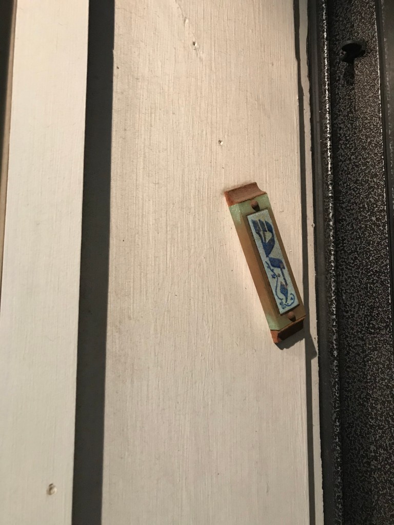 [I failed to take a photo of a Samaritan mezuzah, so this photo is not attributed to me. It is from Wiki Commons, meaning that it is in public domain. https://commons.wikimedia.org/wiki/File:Mezuzah_IMG_2125.JPG]