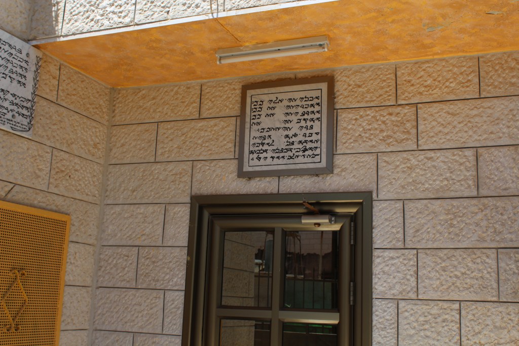 There are a few other interesting comparisons between the Samaritans and the Jews. For example, on Mount Gerizim, I saw an outdoor, circular area, where the Samaritans still sacrifice a lamb on Passover each year. Visitors are actually welcome to watch. Jews no longer literally sacrifice a lamb on Passover, but they do put a lamb bone on their Passover table to remember the ancient practice. Similarly, like the Jews, the Samaritans follow Deuteronomy 6:9’s injunction of placing God’s commandments on their doorposts. However, whereas Jews follow it by placing a tiny scroll (mezuzah) containing Deuteronomy 6:4-9 and 11:13-21 inside a little box adhered to their doorposts, Samaritans carve out a Bible verse of their choosing above their doorways.