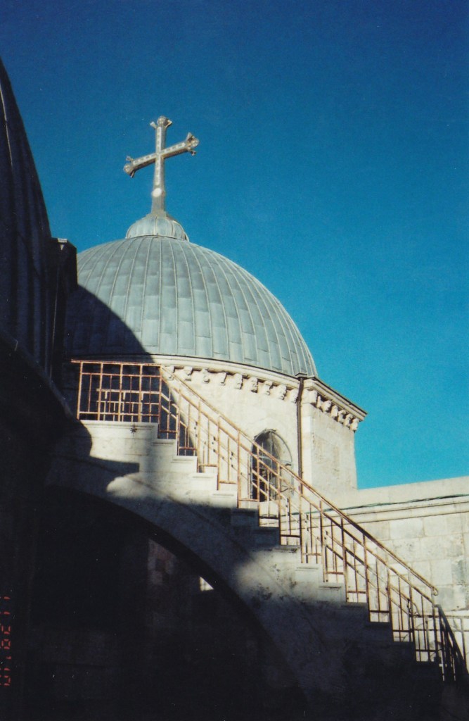 I had the opportunity to go on the top of the Church of the Holy Sepulchre’s smaller dome, because I had a wonderful professor who received permission to take her class up there. This dome was part of the section of the Church owned by the Greek Orthodox Church. In addition to going on top of the dome, we also went into a little room below it, where people work on repairing broken icons that churches send to them from all over the world. My professor also took us to a part of the Church’s roof that is accessible to the public, and is the section owned by the Ethiopian Church. Additionally, she took us to a water tunnel beneath the Church. However, I, unfortunately, cannot remember how to find any of those places.