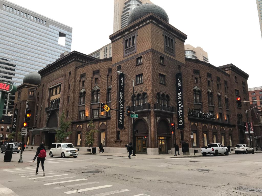 As an added bonus, here is a photograph of another Moorish Revival building in Chicago, located at 600 N. Wabash Ave. It is of the former Medinah Temple, built in 1912 as an auditorium for the Shriners, a group related to the Freemasons, which often employs Middle Eastern terminology and designs. Currently, the building houses a Bloomingdale’s department store, but that was supposed to end in 2020, so we shall see what happens. The building became a Chicago landmark in 2001.