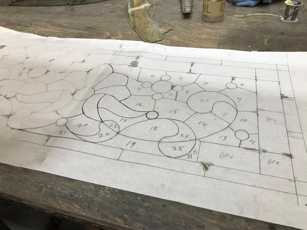 He ultimately uses that sketch as the blueprint for creating the stained glass. This involves cutting out pieces of glass into different shapes like a puzzle, and then sticking them together in a process called soldering.